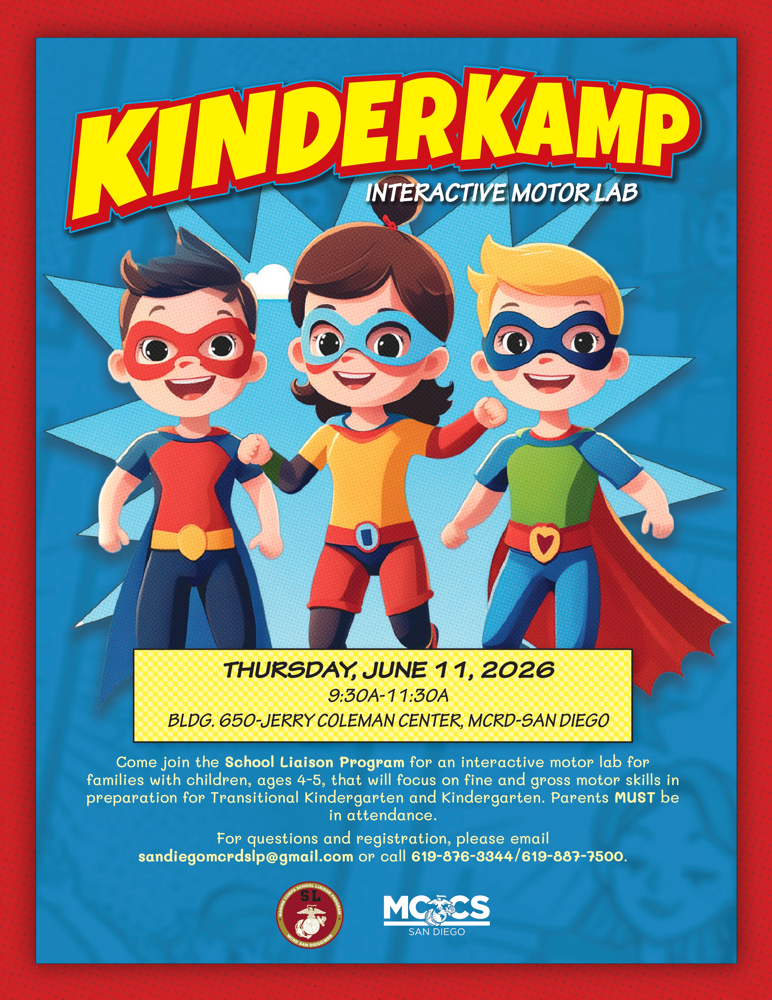 Email: sandiegomcrdslp@gmail.comCome join the School Liaison Program for an interactive motor lab for families with children, ages 4-5, that will focus on fine and gross motor skills in preparation for Transitional Kindergarten and Kindergarten. Parent MUST be in attendance.