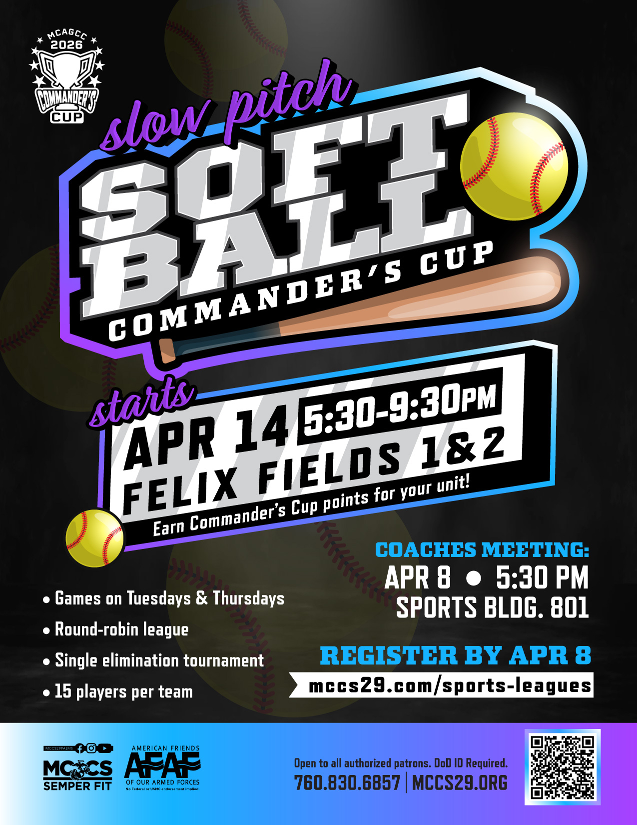 Free and open to all authorized patrons. DOD Civilians must be cleared by sports office in order to participate. Civilians and non-active duty must pay $20 player fee for the season before being cleared to play.