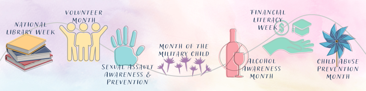 | April 1 | Awareness Kickoff Event. 0900-1000 @ Dewey Square. Proclamation signing, resource tables and more. Everyone welcome to attend. |